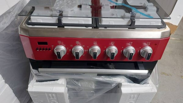 een rode luxe uitvoering gasfornuis 60cm breed.