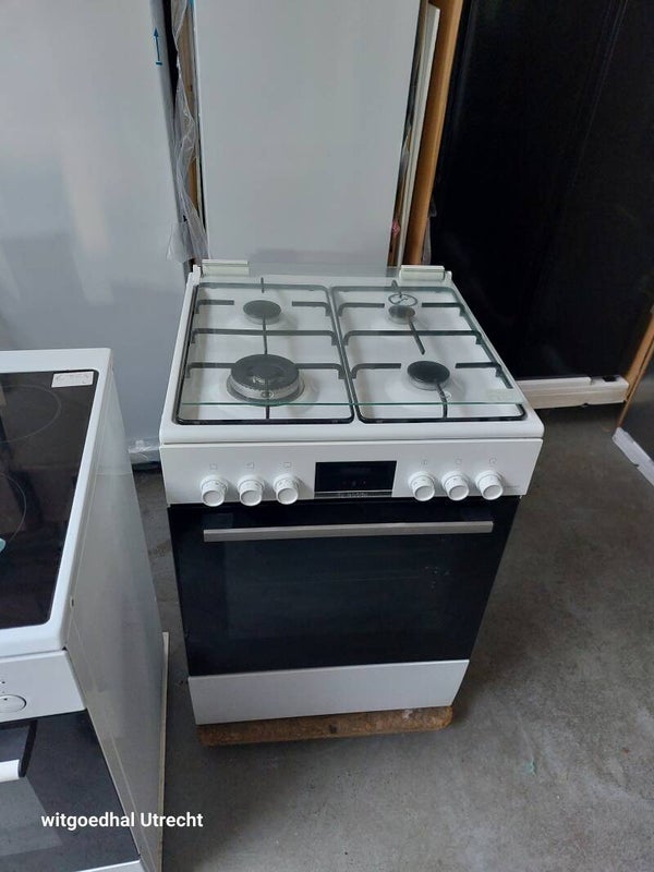 Een gereviseerde Bosch gasfornuis Met heteluchtoven en wokbrander.